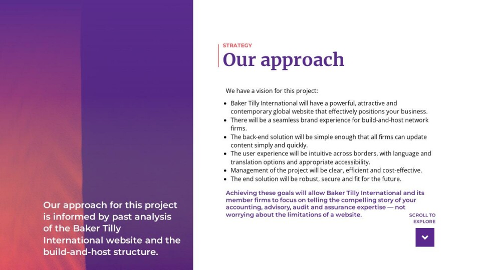 Achieving these goals will allow Baker Tilly International and its member firms to focus on telling the compelling story of your accounting, advisory, audit and assurance expertise — not worrying about the limitations of a website.